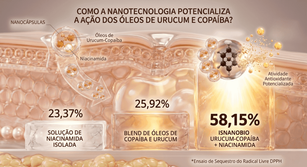 Os resultados provam um aumento expressivo na atividade antioxidante quando os ativos são nanoestruturados. Esse efeito não é apenas uma soma, mas uma verdadeira sinergia impulsionada pela maior disponibilidade molecular que a nanotecnologia proporciona.